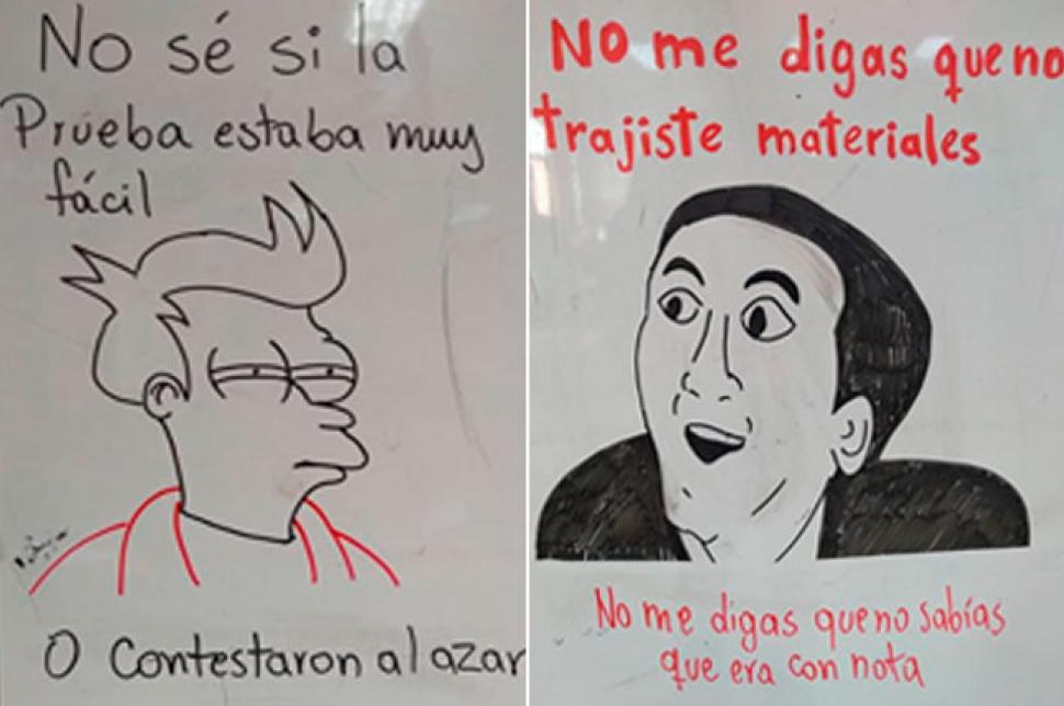 Con el fin de motivar a sus estudiantes, el profesor dibuja memes en el tablero.