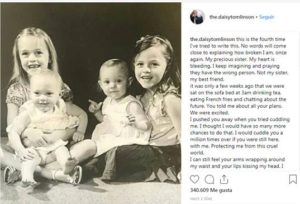 »Las palabras ni siquiera comienzan a describir qué tan conmocionados y rotos estamos todos. Eras mi mejor amiga, hermana, motivadora y persona que podría hacerme reír hasta que lloré. Estoy perdido sin ti y la idea de no volver a verte nunca más me asusta como si no hubieras creído. Te amaré por siempre y siempre, y tú y mamá tendremos un lugar en mi corazón hasta el día en que me muera. Por favor, dígame que nos está cuidando y que siempre recordará la forma en que todos nos reímos juntos. Nuestros recuerdos se quedarán conmigo para siempre. Hicimos tantos. Me acuerdo, Dais, Lotts y ustedes durmiendo en la misma habitación en dos literas y charlamos toda la noche sobre cosas al azar que nos hicieron reír. Fuiste el mejor en contar historias. Mamá te necesitaba y tú la necesitabas desesperadamente. Estoy tan contenta de que estén juntas ahora y ella te tiene a ti para frotar sus pies en el cielo como solías hacerlo. Rezo para que estés en un lugar mejor ahora. Te amamos como si no hubieras creído. Vuela alto mi hermosa hermana 👼»