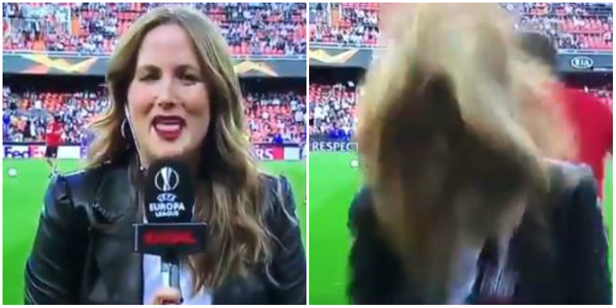 Mónica Benavet una reportera española recibió un balonazo en la cabeza mientras entregaba un informe en vivo de la Liga de Europa entre Valencia y Arsenal.