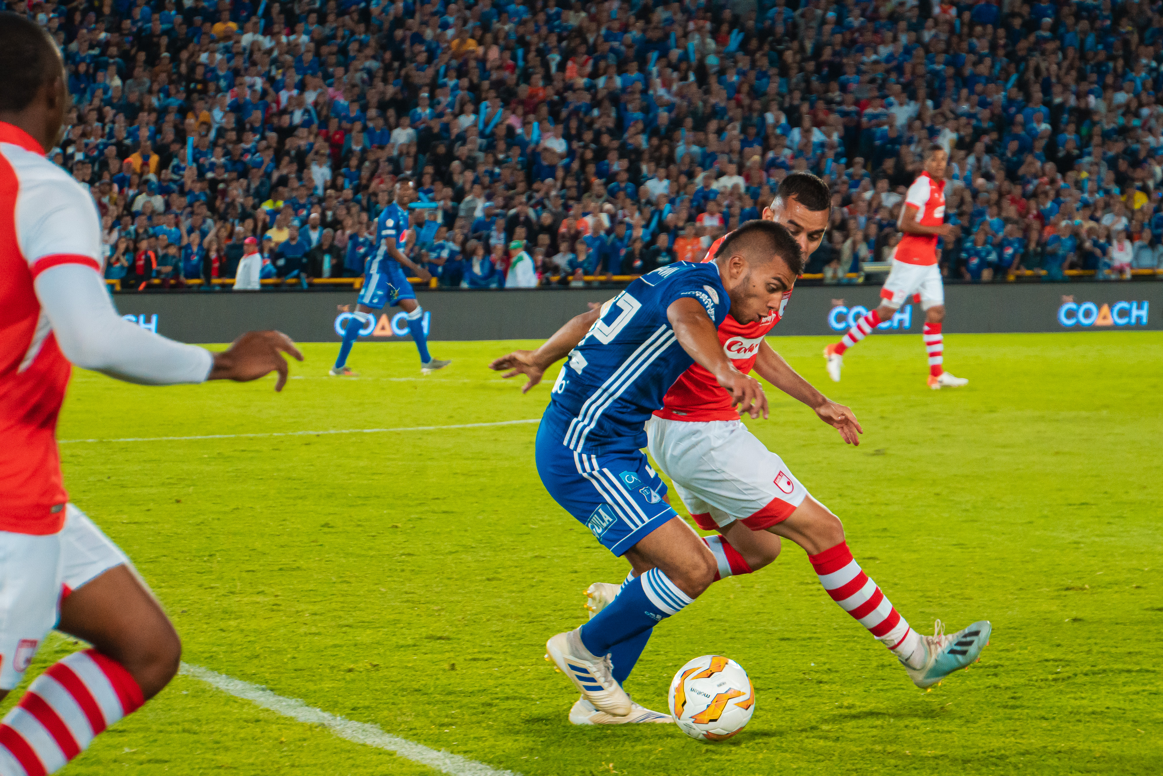 Millonarios salió con la propuesta de presionar alto la salida de Santa Fe, con el fin de que el medio campo del cuadro albi rojo no influyera en el desarrollo del partido, Pereira, Duque y Silva manejaron los tiempos de su equipo en esa zona, cortando circuitos de juego y generando ocasiones de gol con su primer pase y amplitud a los costados para verticalizar la cancha a su favor. La primer ocasión de gol clara la tendría el elenco cardenal por el intermedio de Diego Valdés que remató y falló en el área defendida por Wuilker Faríñez al minuto 35. Posterior a esto los embajadores responderían mediante una contra que finalizó en gol gracias a la definición de Hansel Zapata a la salida de Leandro Castellanos 1-0 a favor de Millomarios al minuto 36. José Guillermo Ortíz recibió una pelota filtrada por Juan Pablo Vargas y eludió al portero para definir con tranquilidad y plasmar el 2-0 en el marcador al minuto 44. Santa Fe iba en busca del tanto de la tranquilidad para irse con posibilidades al descanso y lo encontró gracias a un certero remate de cabeza de Fainer Torijano tras centro por la derecha de Alexander Porras 1-2, venciendo a Faríñez que estaba inspirando en la portería. Así terminaría la primera mitad.