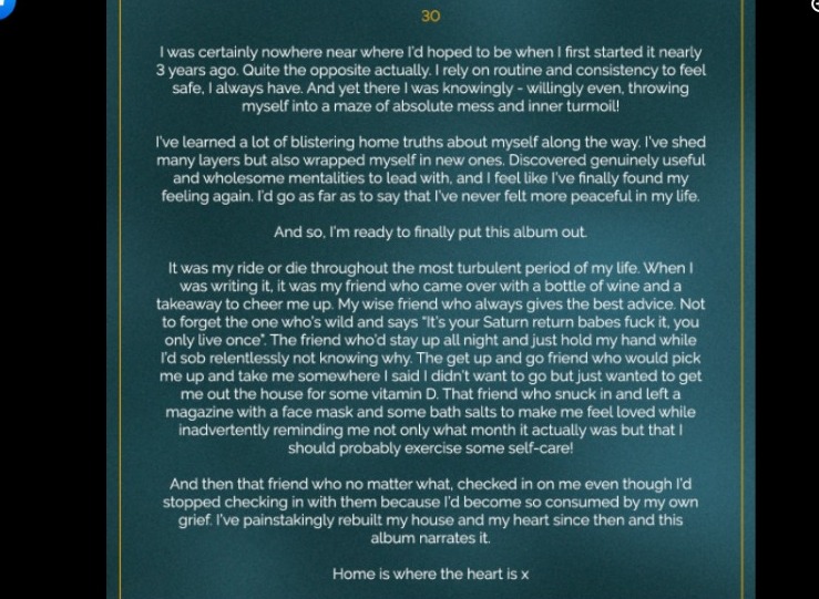 mediante una publicación de Facebook la cantante dice » ciertamente no estaba en ninguna parte donde deseaba estar cuando empecé hace unos 3 años. En realidad es todo lo contario, confió en la rutina y la constancia para sentirme segura «.