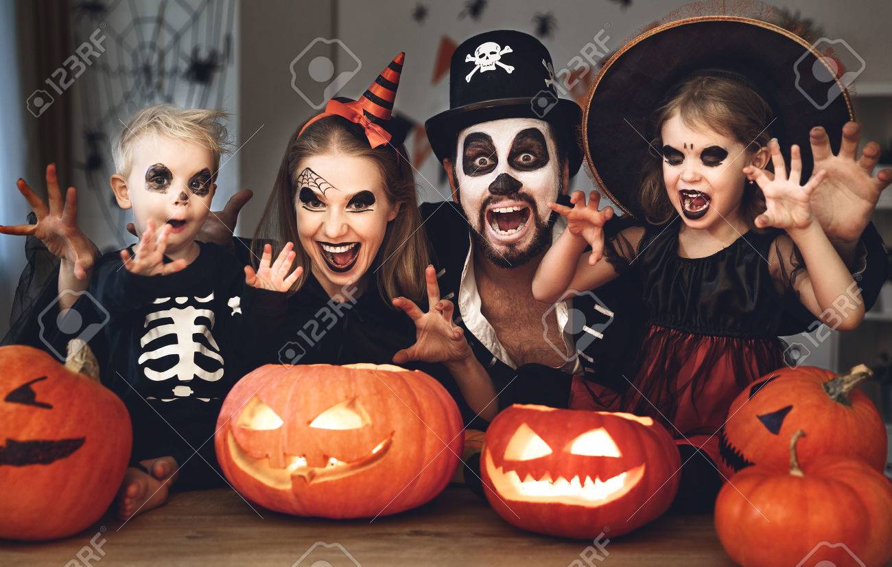 happy family mother father and children in costumes and makeup on a celebration of Halloween