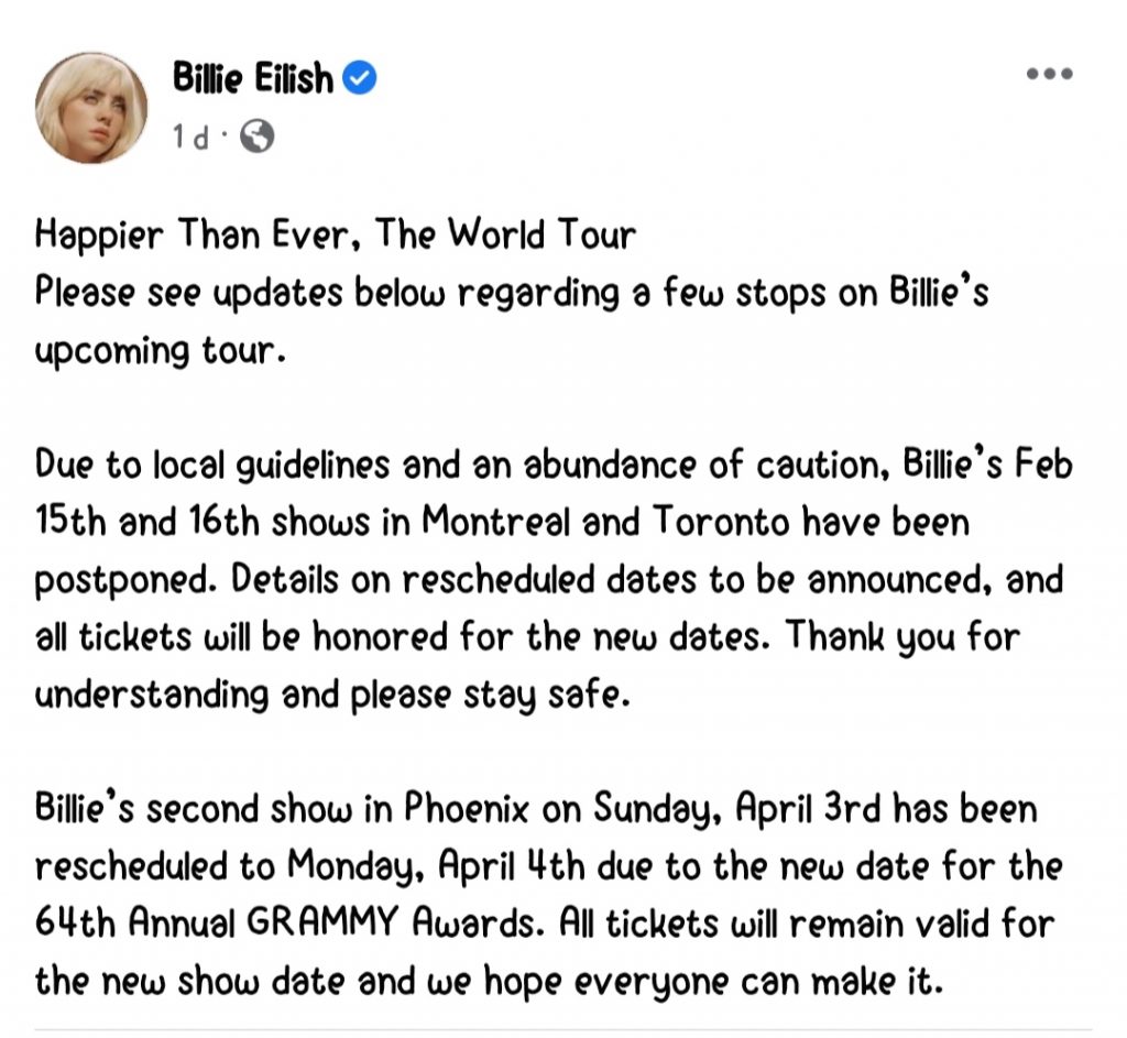 Además Billie anunció que su presentación, en Phoenix, del domingo 3 de abril, se reprogramó al lunes 4 del mismo mes debido a que en dicha fecha se llevará a cabo la edición 64 de los premios Grammy.