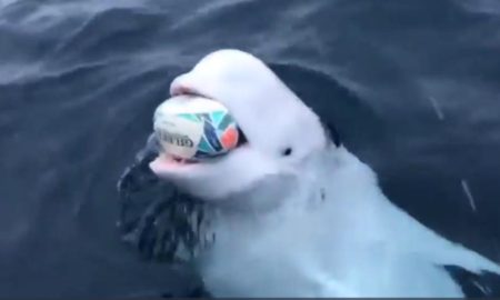 En redes sociales se ha hecho viral el divertido video de una ballena beluga jugando a l apelota con un marinero que...
